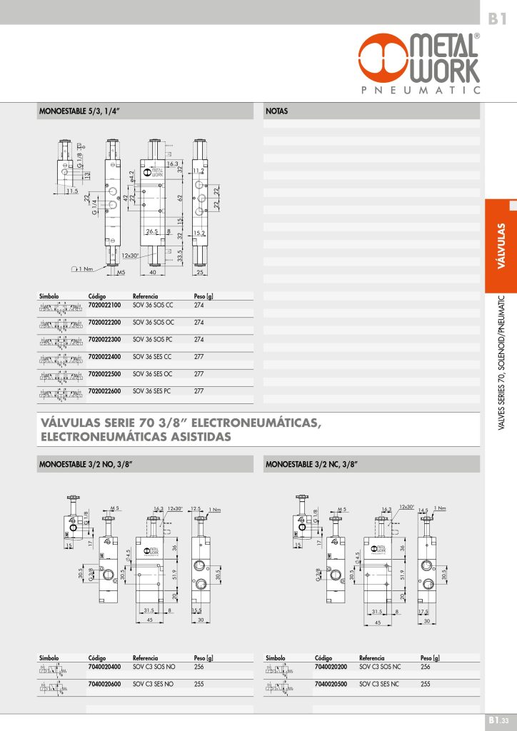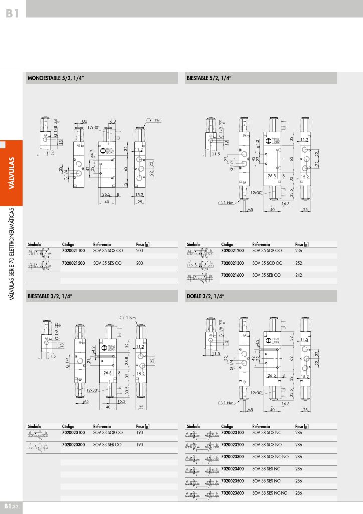 Representan La Gama Tradicional Y Completa De La Gamametal Work. Disponibles En Tres Tamaños: 1/8’’-1/4’’-3/8”-1/2’’, Tres Versiones: 3/2, 5/2, 5/3, Cuatro Accionadoresdiferentes (Mecánicos, Manual, Neumático Y Eléctrico).Gracias A Las Múltiples Posibilidades De Fijación: En Líneas,En Pared, Sobre Cilindro (Utilizando El Soporte Pertinente)O En Batería (Sobre Base Múltiple O Modular), Las Válvulasserie 70 Están En Condiciones De Satisfacer Las Más Diversasaplicaciones.También Está Disponible Para Los Tipos Y Tamaños Más Utilizadosuna Gama De Válvulas Diseñadas Con Componentes Para Su Utilizaciónespecífica A Baja Temperatura (Válvulas Serie 70 Lt).Estas Válvulas Altamente Fiables Cumplen Con La Normativa, De Acuerdo Con Lo Que Se Especifica En Los Documentos Y Certificados Disponibles En Línea, Incluyendo Atex, Iso 13489, Sil.